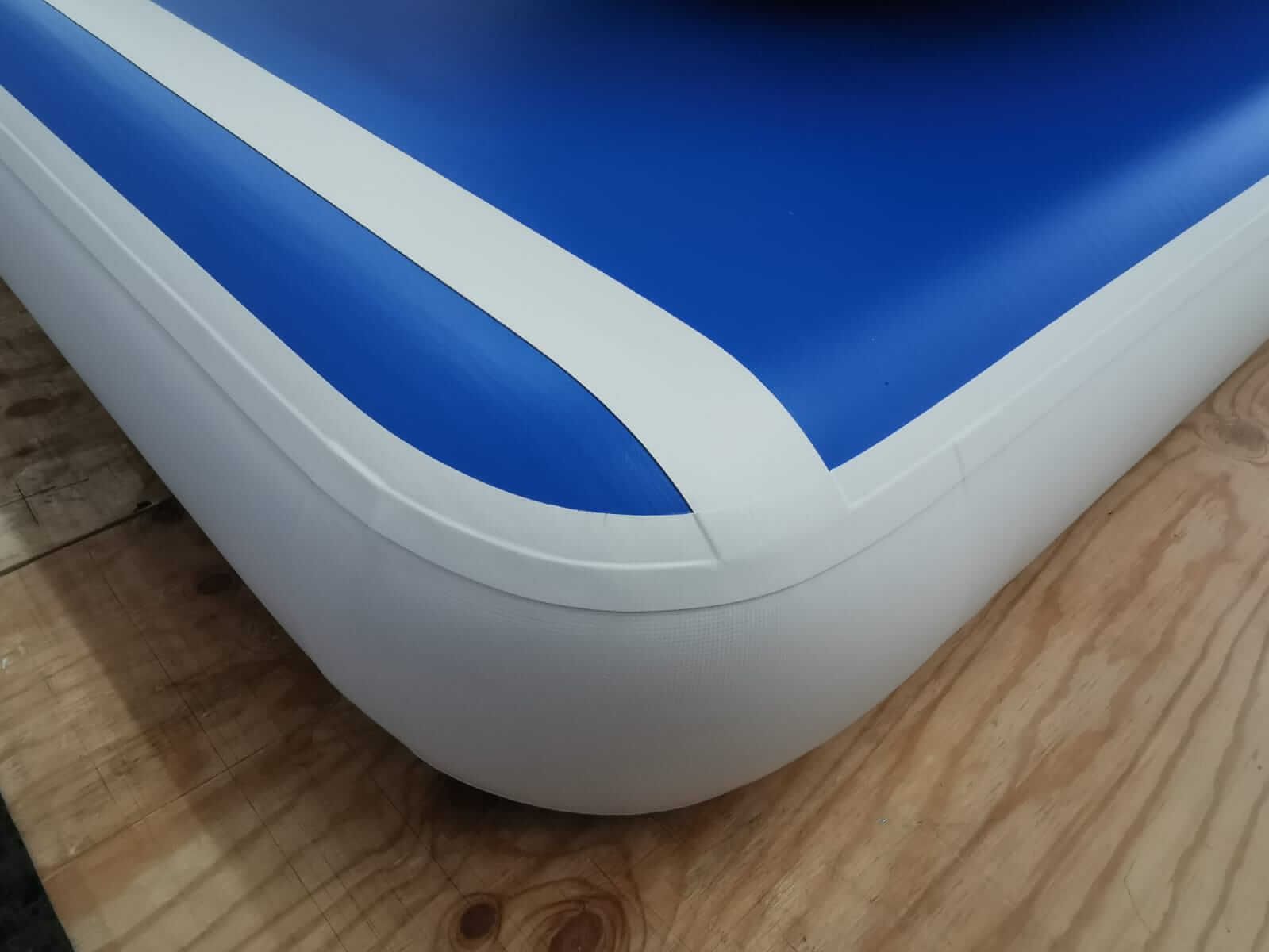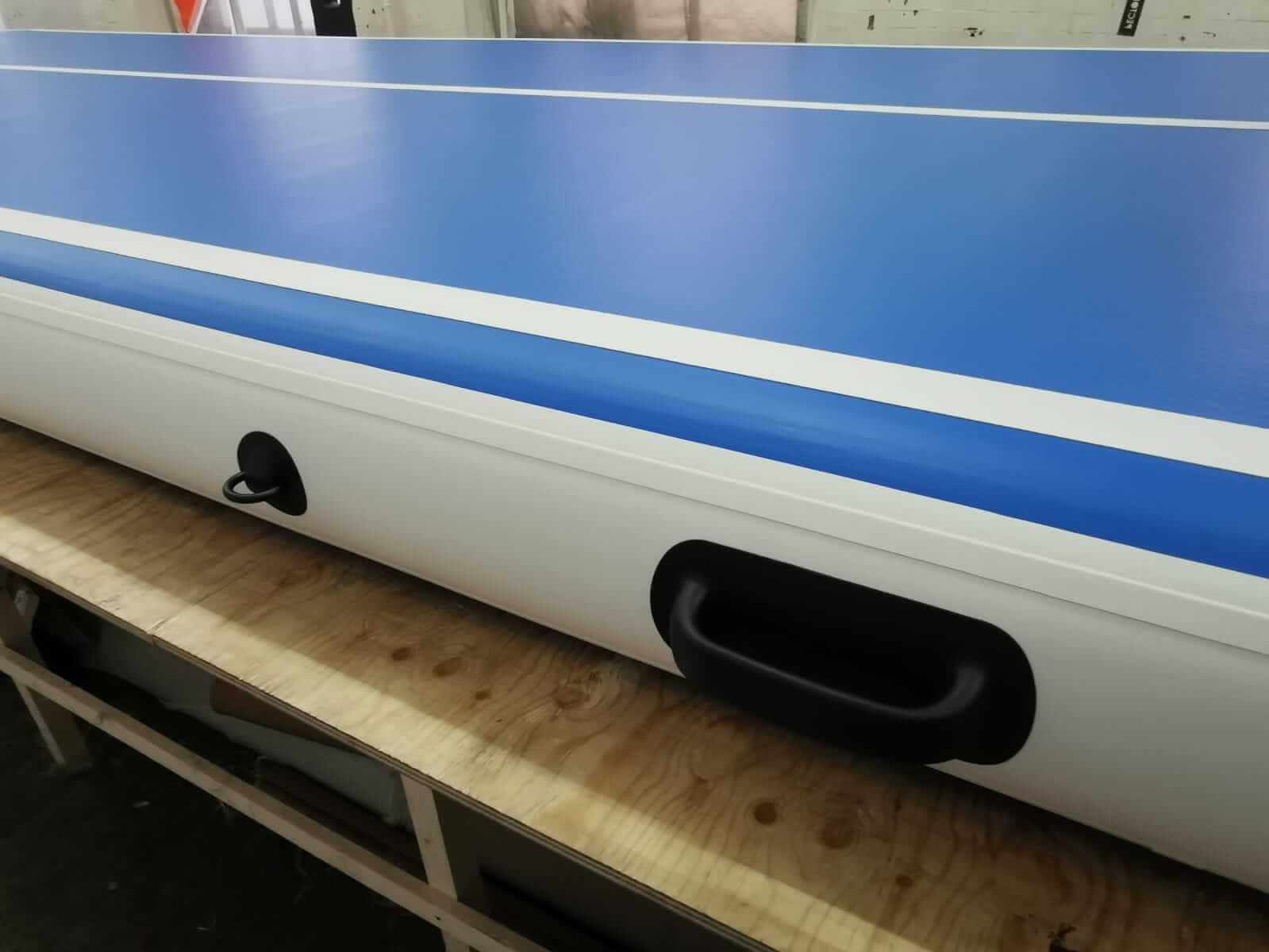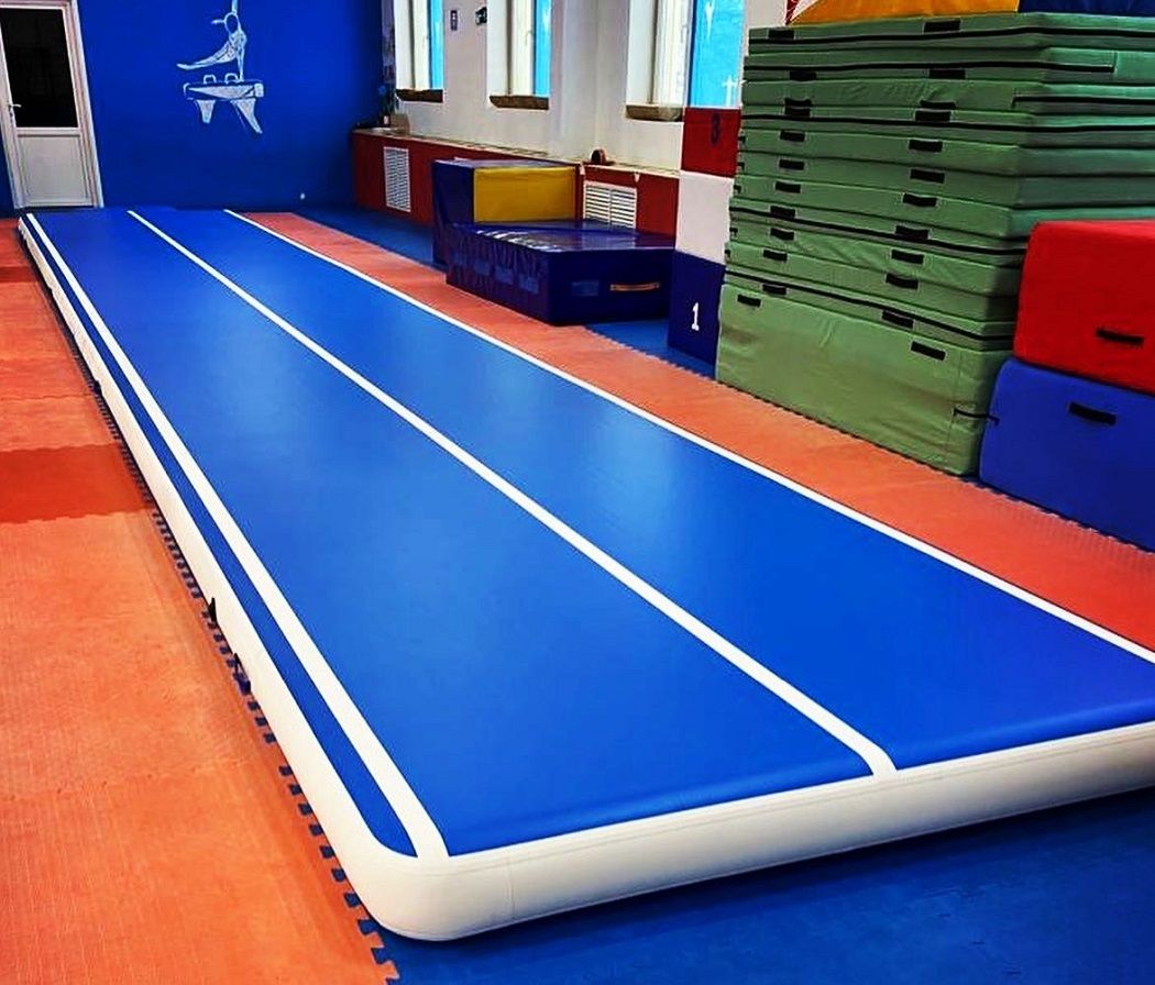 Дорожка длиной 12 метров изготовлена из 6-слойного армированного ПВХ с рёбрами жёсткости и усиленными швами, что исключает деформацию при активных нагрузках. Антискользящее покрытие и толщина 20 см обеспечивают безопасное приземление, а экологичный материал (без токсичных добавок) подходит для детей. Вес конструкции — 79,2 кг, что делает её мобильной для использования в залах, на улице и мероприятиях.