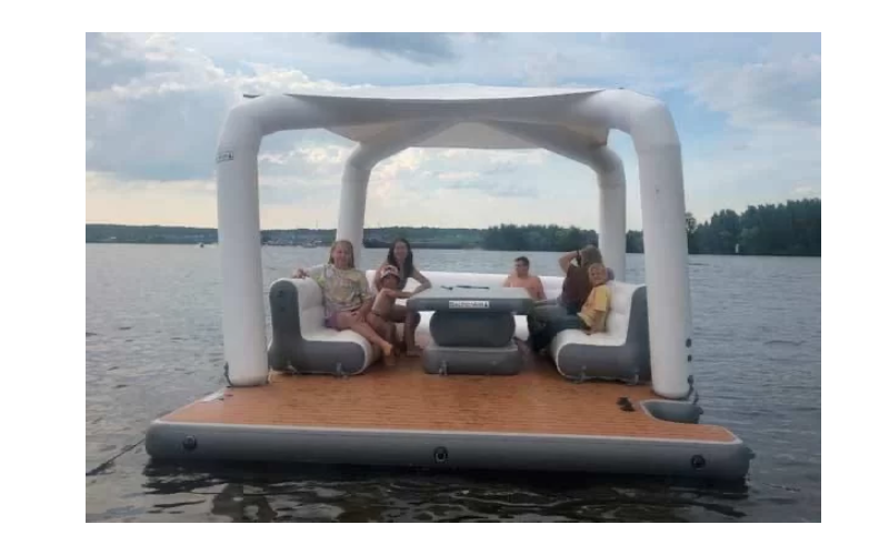- Просторный и Удобный: Плот вмещает до 8 человек и оборудован мягкими креслами и просторным столом, который идеально подходит для проведения вечеринок, семейных пикников или корпоративных мероприятий. Специальный вырез для холодильника позволяет наслаждаться прохладительными напитками в любой момент.