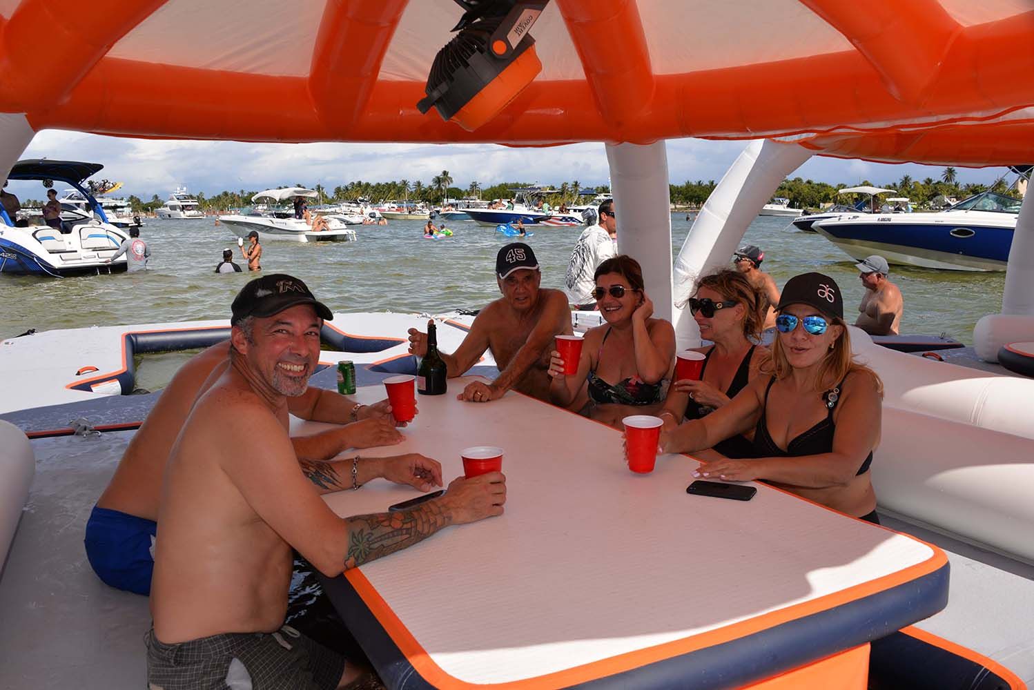 Флагманский плот размером 4.5x3.4 м с толщиной 20 см — это просторная платформа для вечеринок, семейных пикников и активного отдыха. Вмещает более 10 гостей, оборудован столешницей 220 см, лестницей в воду и зоной для загара. Надежная конструкция выдерживает до 1000 кг!