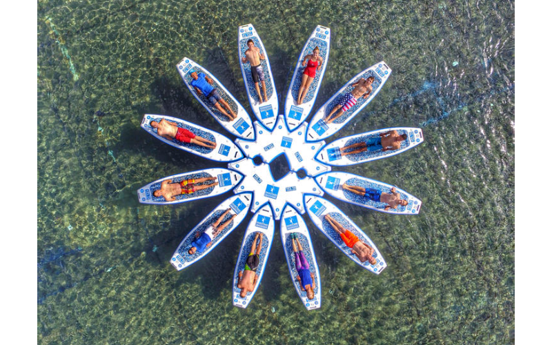 Компактная надувная платформа 300x150 см — идеальное решение для небольших групп, семейных прогулок и персональных тренировок на воде! Предназначена для крепления 6 SUP-бордов, что позволяет организовать занятия йогой, фитнесом или отдых в кругу друзей. Тренер или ведущий располагается в центре платформы, участники — на сапах по периметру. Легкая, мобильная и прочная конструкция подходит для озер, рек, бассейнов и коммерческого использования.